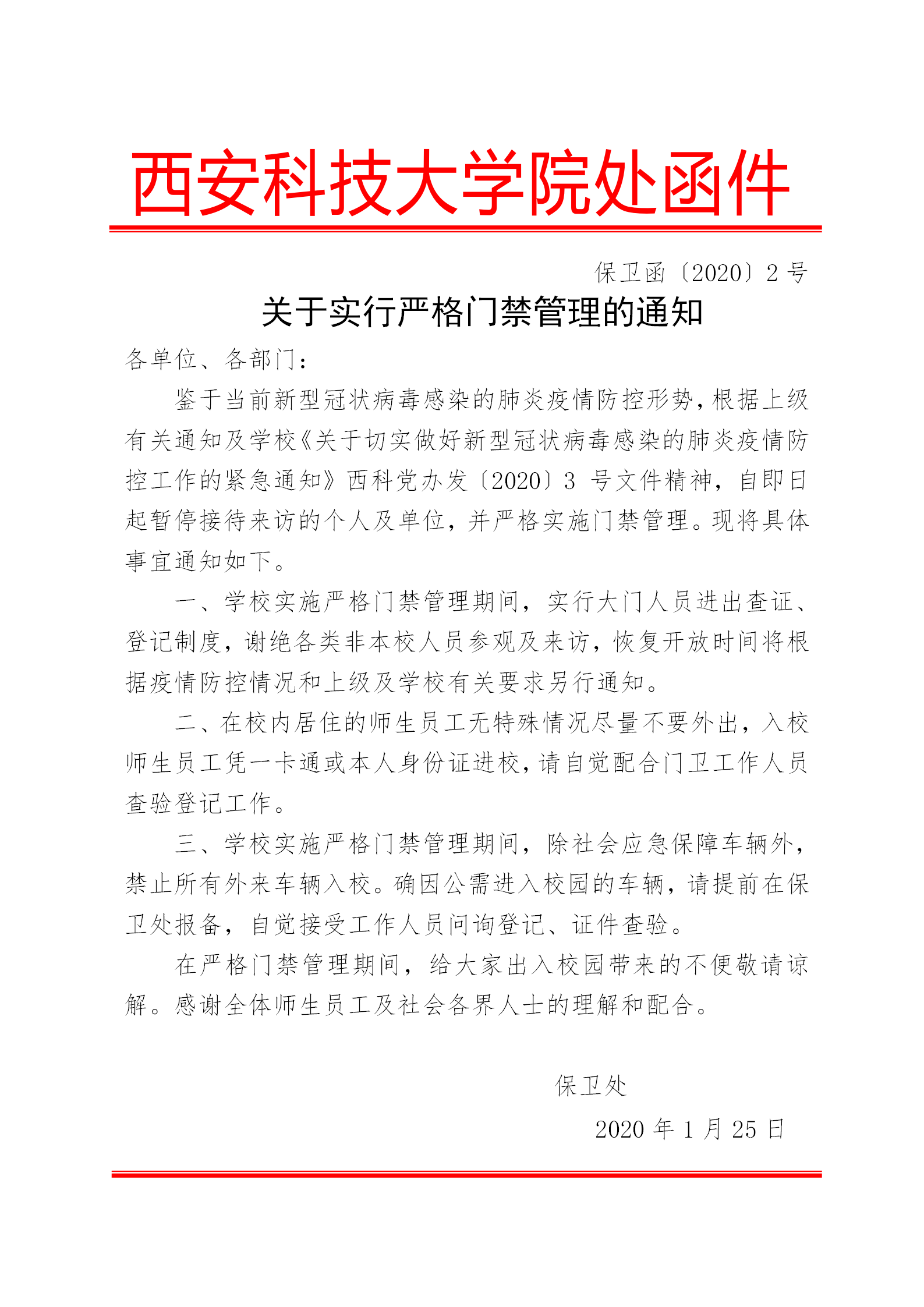 关于实行严格门禁管理的通知(保卫函〔2020〕2号)